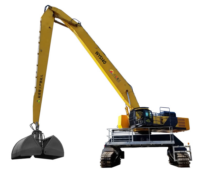 This heavy-duty wharf ship unloader product is a "heavy, high mobility" energy-saving and environmental friendly bulk cargo handling and grabbing equipment with "dual power" invention patent technology of internal combustion engine and 380V electric interchangeable operation, which is imported from Sweden's "modidok" technology in China and manufactured after optimization design and modification on the basis of the structure of a 75 ton mine excavator.