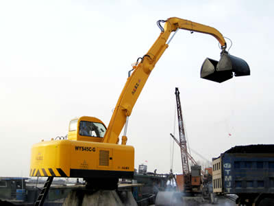 WYS42C-G型電動(dòng)液壓固定式疊臂抓料機(jī)的回轉(zhuǎn)、卷揚(yáng)、變幅及抓斗開閉作業(yè)等全部采用電動(dòng)液壓驅(qū)動(dòng),先導(dǎo)控制。具有作業(yè)平穩(wěn)、各動(dòng)作可無級(jí)調(diào)速;同等作業(yè)效率下可比內(nèi)燃機(jī)驅(qū)動(dòng)節(jié)省60%能耗;司機(jī)室安裝冷暖兩用空調(diào)、多向調(diào)節(jié)座椅,作業(yè)環(huán)境舒適;配裝不同的液壓抓斗后均有自重小、抓取力大,對(duì)沙石、煤等散裝原料進(jìn)行抓取作業(yè)。