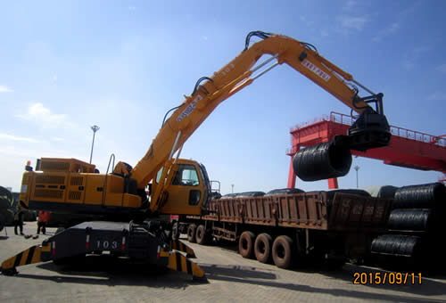八達(dá)重工雙動力抓料機(jī)改進(jìn)后配裝盤圓、鋼卷專用裝卸吊具,應(yīng)用于量大鋼卷、盤圓的裝卸車、裝卸船、貨場的堆碼垛作業(yè)。