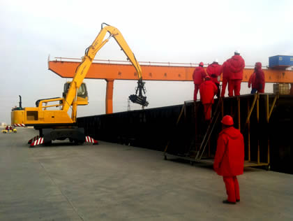 圖中所示:該抓管機正在進行鋼管的卸火車作業(yè),卸火車裝汽車一次完成!鋼管由于太長,抓取時重心不太好掌握,我公司專門為其設(shè)計了專用抓具,便于抓取時掌握鋼管的重心,大大提高了鋼管的裝卸效率,受到了客戶的稱贊。